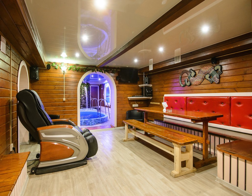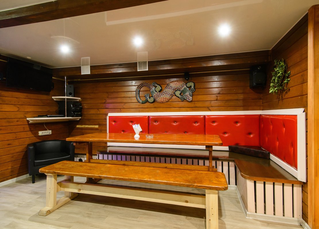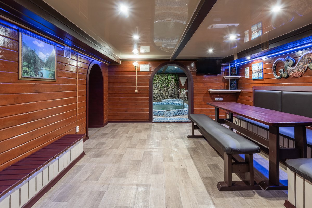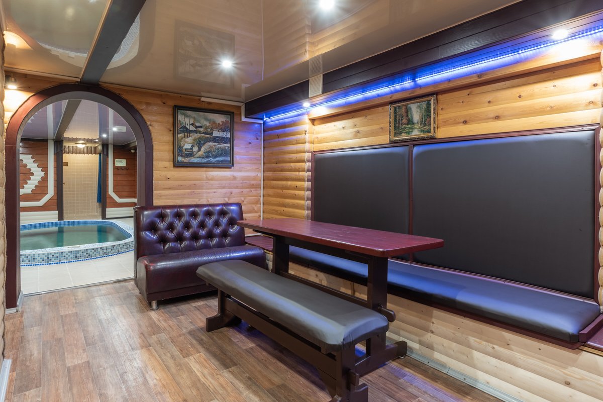 Не хочется в бассейн? Не проблема! Вместо этого можно посидеть в нашей комнате отдыха. Мы постарались создать здесь комфортный, стильный интерьер из максимально натуральных, экологичных материалов, выбрать мебель, которая будет одновременно удобной и приятной глазу. Надеемся, что вы его оцените! Также у нас работает бар, а если нужно, вы можете прийти и со своей едой - мы не против! Только не забывайте, что плотная трапеза непосредственно перед посещением парной - это не самая хорошая идея, согласно мнению докторов. А вот после парной - совсем другое дело!